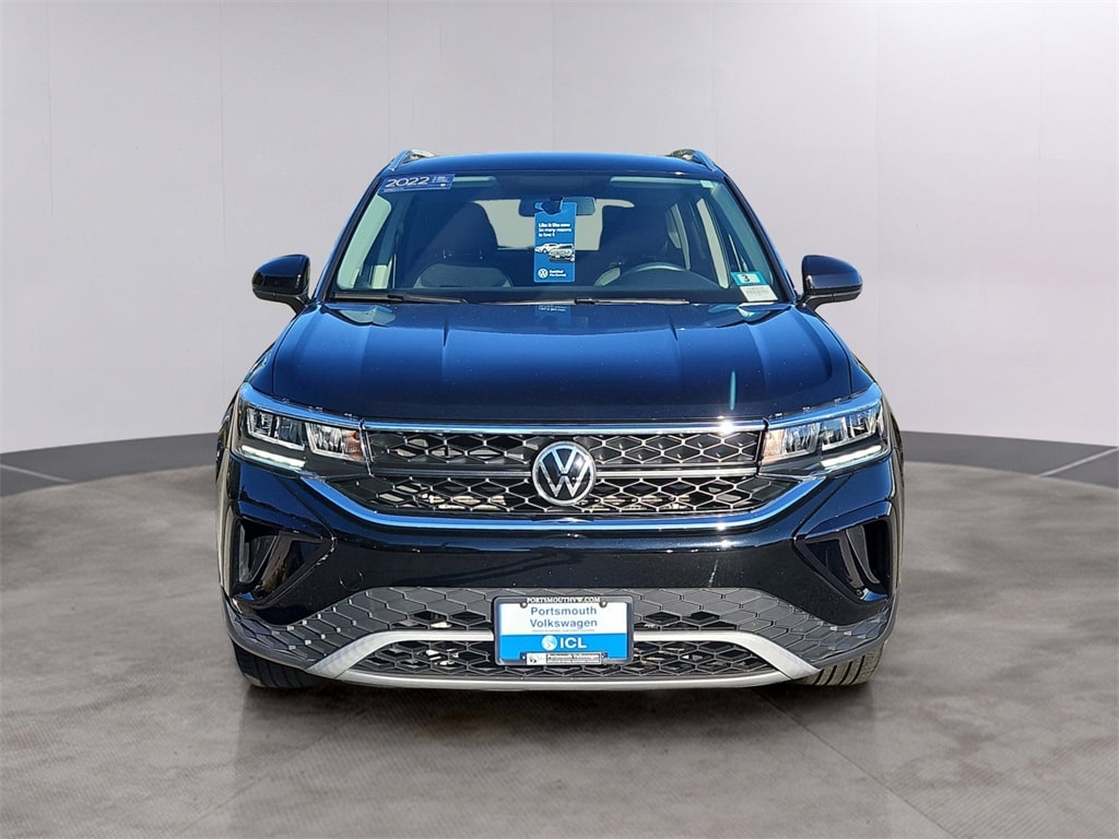 Certified. Deep Black Pearl 2022 Volkswagen Taos 1.5T SE AWD 7-Speed DSG Automatic with Tiptronic 1.5L I4 Turbocharged DOHC 16V LEV3-SULEV30 158hp 4-Wheel Disc Brakes, ABS brakes, Air Conditioning, AM/FM radio: SiriusXM with 360L, Brake assist, Bumpers: body-color, Compass, Delay-off headlights, Driver door bin, Driver vanity mirror, Dual front impact airbags, Dual front side impact airbags, Electronic Stability Control, Emergency communication system: Car-Net, Exterior Parking Camera Rear, Four wheel independent suspension, Front Assist, Front Center Armrest, Front reading lights, Front Strut Rear Multi-Link Suspension, Fully automatic headlights, Heated door mirrors, Heated Front Comfort Seats, Heated front seats, Illuminated entry, Leather Shift Knob, Outside temperature display, Overhead console, Panic alarm, Power door mirrors, Power driver seat, Power steering, Rear seat center armrest, Rear window defroster, Roof rack: rails only, Security system, Speed-sensing steering, Spoiler, Traction control, Variably intermittent wipers, Wheels: 18" 2-Tone Machined Alloy.