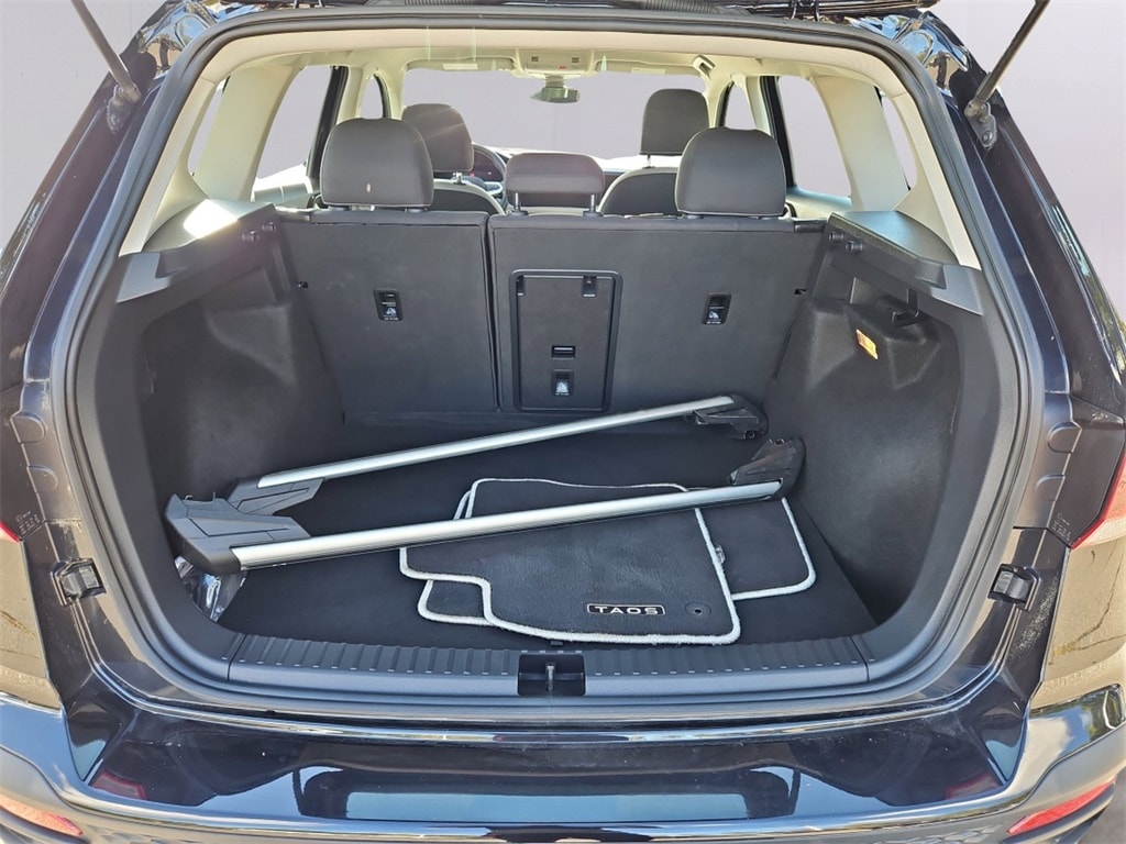 Certified. Deep Black Pearl 2023 Volkswagen Taos 1.5T S AWD 7-Speed DSG Automatic with Tiptronic 1.5L I4 Turbocharged DOHC 16V LEV3-SULEV30 158hp Carfax 1 Owner! Accident Free!, 18" Alloy Wheels, 4-Wheel Disc Brakes, 6 Speakers, ABS brakes, Air Conditioning, AM/FM radio, Brake assist, Cloth Seating Surfaces, Delay-off headlights, Driver door bin, Driver vanity mirror, Dual front impact airbags, Dual front side impact airbags, Electronic Stability Control, Emergency communication system: VW Car-Net Safe & Secure 5-year, Exterior Parking Camera Rear, Four wheel independent suspension, Front reading lights, Front Strut Rear Multi-Link Suspension, Fully automatic headlights, Heated door mirrors, Heated Front Bucket Seats, Heated front seats, Illuminated entry, Low tire pressure warning, Outside temperature display, Overhead airbag, Overhead console, Panic alarm, Power door mirrors, Power steering, Power windows, Radio data system, Radio: Composition Color AM/FM, Rear anti-roll bar, Rear seat center armrest, Rear window defroster, Rear window wiper, Remote keyless entry, Speed-sensing steering, Split folding rear seat, Steering wheel mounted audio controls, Tachometer, Traction control, Variably intermittent wipers.