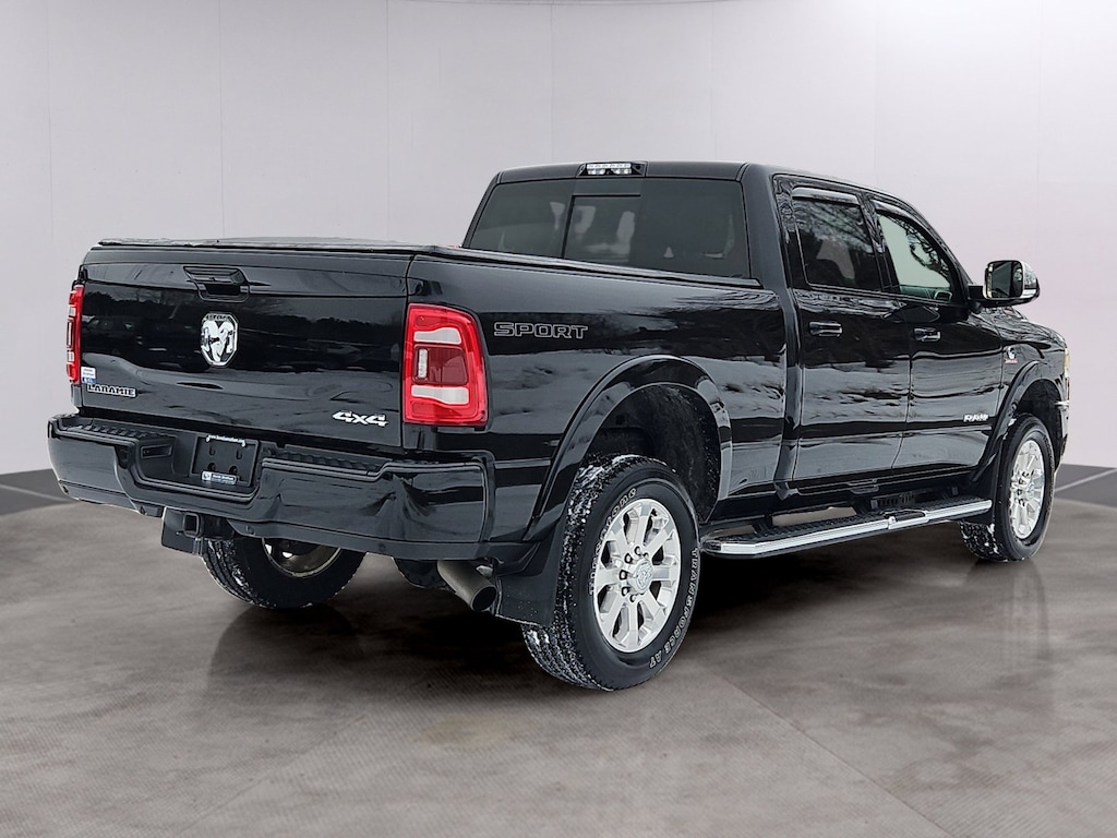 Bed Utility Group (Deployable Bed Step, LED Bed Lighting, and Spray In Bedliner), Cold Weather Group (Engine Block Heater and Winter Front Grille Cover), Heavy Duty Snow Plow Prep Group (220 Amp Alternator), Laramie Level 2 Equipment Group (1-Year SiriusXM Guardian Trial, 17 Speaker harman kardon Premium Sound, 2nd Row In Floor Storage Bins, 5-Year SiriusXM Traffic Service, 5-Year SiriusXM Travel Link Service, 8.4" Touchscreen Display, Apple CarPlay, Auto High Beam Headlamp Control, Blind Spot & Cross Path Detection, Disassociated Touchscreen Display, Exterior Mirrors w/Memory, Foam Bottle Insert (Door Trim Panel), For Details Visit DriveUconnect.com, Google Android Auto, GPS Antenna Input, GPS Navigation, HD Radio, Heated Second Row Seats, Integrated Center Stack Radio, Integrated Voice Command w/Bluetooth, Media Hub w/2 Charge Only USBs, Mirror-Mounted Aux Reverse Lamps, Power Adjustable Convex Aux Mirrors, Power Adjustable Pedals w/Memory, Power Chrome Tow Mirrors w/Convex Spotter & Memory, Radio: Uconnect 4C Nav w/8.4" Display, Radio/Driver Seat/Mirrors/Pedals Memory, Rain Sensitive Windshield Wipers, Remote Tailgate Release, SiriusXM Satellite Radio, SiriusXM Traffic Plus, SiriusXM Travel Link, USB Host Flip, and Ventilated Front Seats), Quick Order Package 2HH Laramie, Sport Appearance Package (Black Interior Accents, Body Color Door Handles, Body Color Grille Surround, Painted Front Bumper, Painted Rear Bumper, and Sport Decal), Towing Technology Group (CTR Stop Lamp w/Cargo View Camera, Surround View Camera System, and Trailer Reverse Guidance), 10 Speakers, 115V Auxiliary Rear Power Outlet, 2 Way Rear Headrest Seat, 20" x 8.0" Polished Aluminum Wheels, 3.73 Axle Ratio, 4 Way Front Headrests, 4-Wheel Disc Brakes, 400W Inverter, ABS brakes, Active Noise Control System, Adjustable pedals, Air Conditioning, Alloy wheels, AM/FM radio: SiriusXM, Apple CarPlay/Android Auto, Auto-dimming Rear-View mirror, Automatic temperature control, Brake assist, Bumpers: chrome, Center Hub, Chrome Flat Wheel-to-Wheel Side Steps, Clearance Lamps, Compass, Delay-off headlights, Driver door bin, Driver vanity mirror, Dual front impact airbags, Dual front side impact airbags, Electronic Stability Control, Electronically Controlled Throttle, Front anti-roll bar, Front Center Armrest w/Storage, Front dual zone A/C, Front fog lights, Front reading lights, Front Seat Back Map Pockets, Fully automatic headlights, Garage door transmitter, Heated door mirrors, Heated Front Seats, Heated front seats, Heated Steering Wheel, Heated steering wheel, I/P Mounted Auxiliary Switches, Illuminated entry, Leather steering wheel, Leather Trim 40/20/40 Bench Seat, Low tire pressure warning, Occupant sensing airbag, Outside temperature display, Overhead airbag, Overhead console, Panic alarm, ParkView Rear Back-Up Camera, Passenger door bin, Passenger vanity mirror, Power 2-Way Driver Lumbar Adjust, Power 2-Way Passenger Lumbar Adjust, Power Adjust 8-Way Driver Seat, Power Adjust 8-Way Front Passenger Seat, Power door mirrors, Power driver seat, Power passenger seat, Power steering, Power windows, Radio data system, Radio: Uconnect 4 w/8.4" Display, Rear 60/40 Folding Seat, Rear anti-roll bar, Rear reading lights, Rear seat center armrest, Rear step bumper, Rear window defroster, Remote keyless entry, Security system, Speed control, Split folding rear seat, Steering wheel mounted audio controls, Tachometer